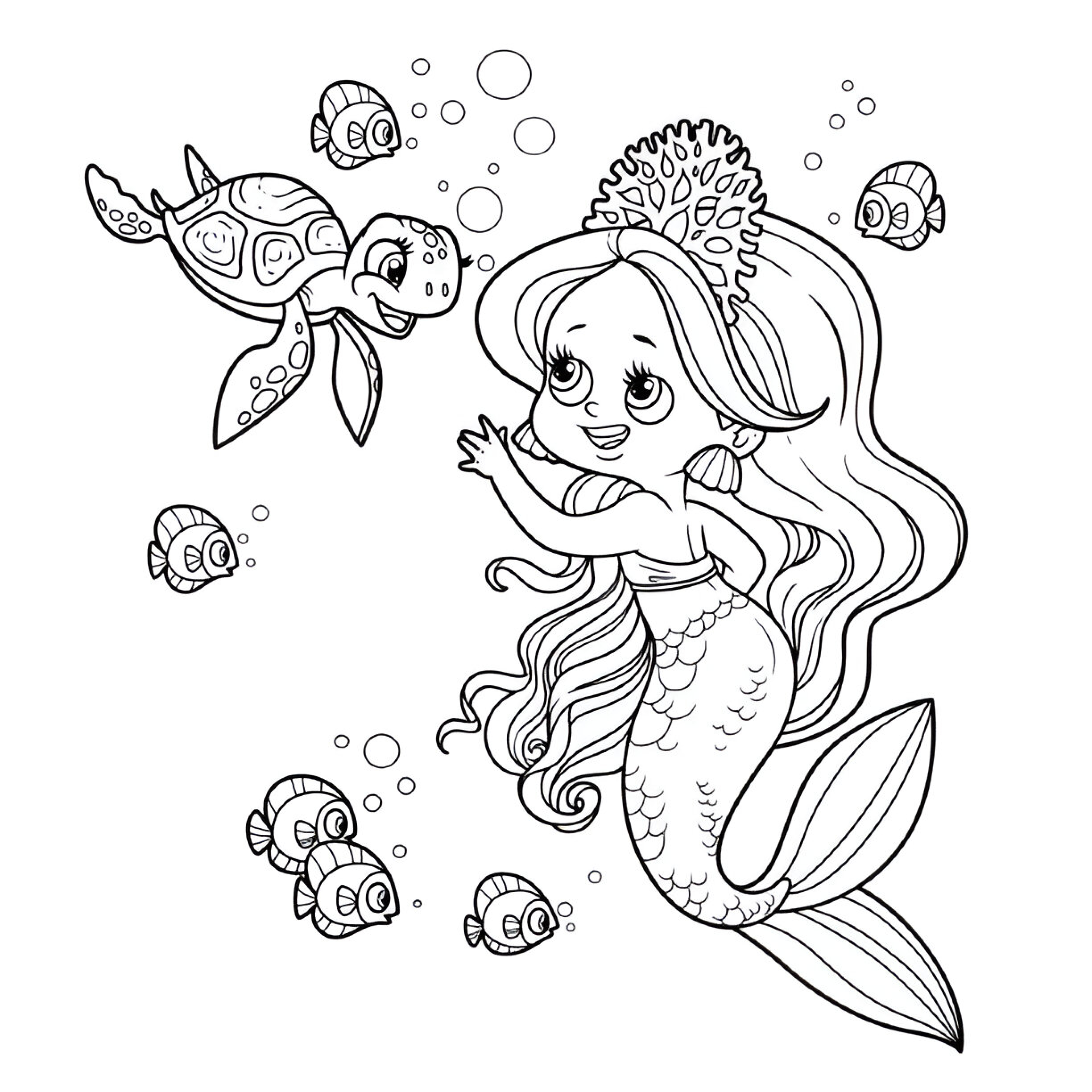 Esta divertida ilustración muestra a una alegre sirena jugando con peces y una tortuga en un entorno marino vibrante. Ideal para que los niños den rienda suelta a su creatividad mientras colorean esta escena llena de vida y color. Perfecta para las pequeñas sirenas y exploradores submarinos que disfrutan de la diversión y la magia del océano.