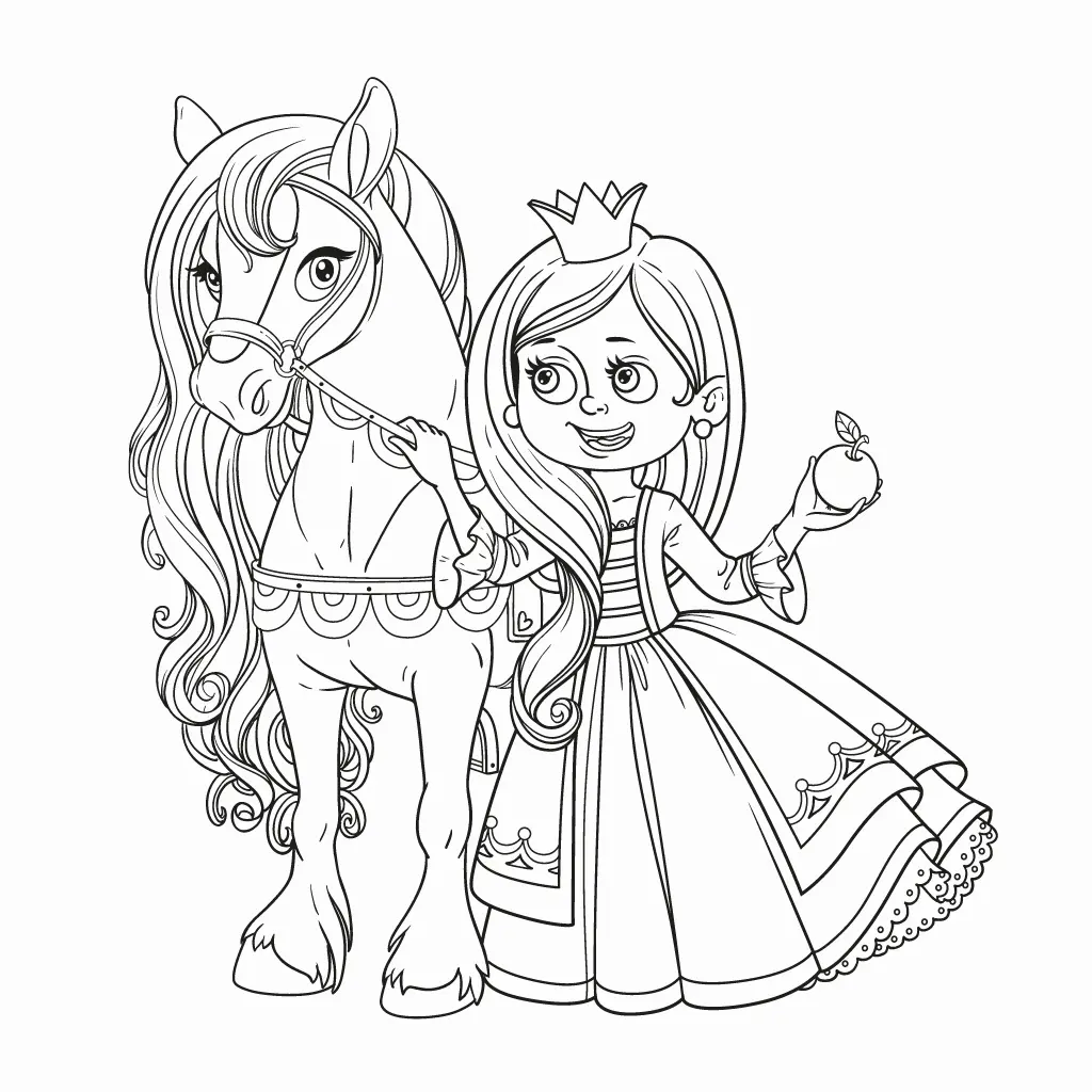 Colorea esta tierna escena de una princesa y su caballo disfrutando de un paseo mágico. Ideal para los niños pequeños.