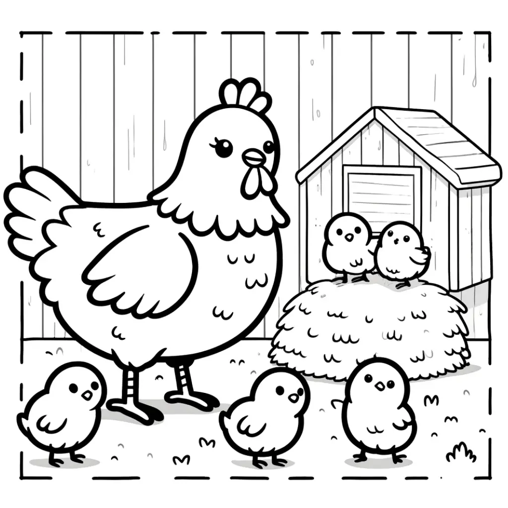 Este dibujo fácil para colorear muestra una gallina con sus pollitos en el gallinero. Perfecto para los más pequeños, fomenta la creatividad y el amor por los animales mientras se divierten coloreando.