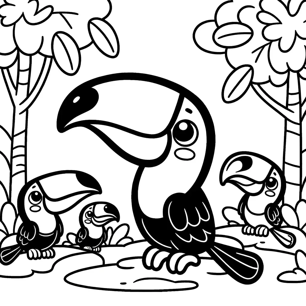 Un dibujo simple y divertido de tucanes para colorear fácilmente. Perfecto para una tarde creativa con los más pequeños.
