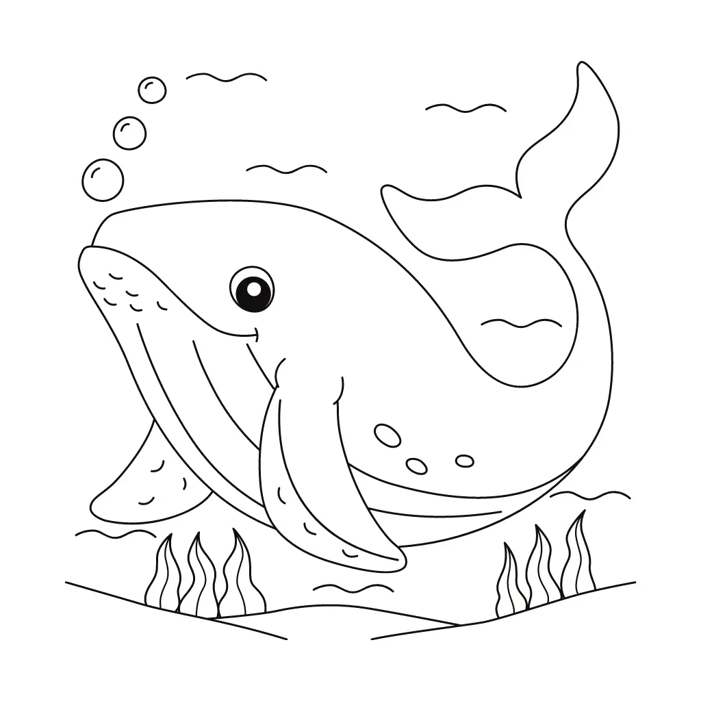 Un dibujo simple de una ballena, ideal para que los niños lo coloreen. Perfecto para desarrollar habilidades artísticas y aprender sobre los gigantes del océano.