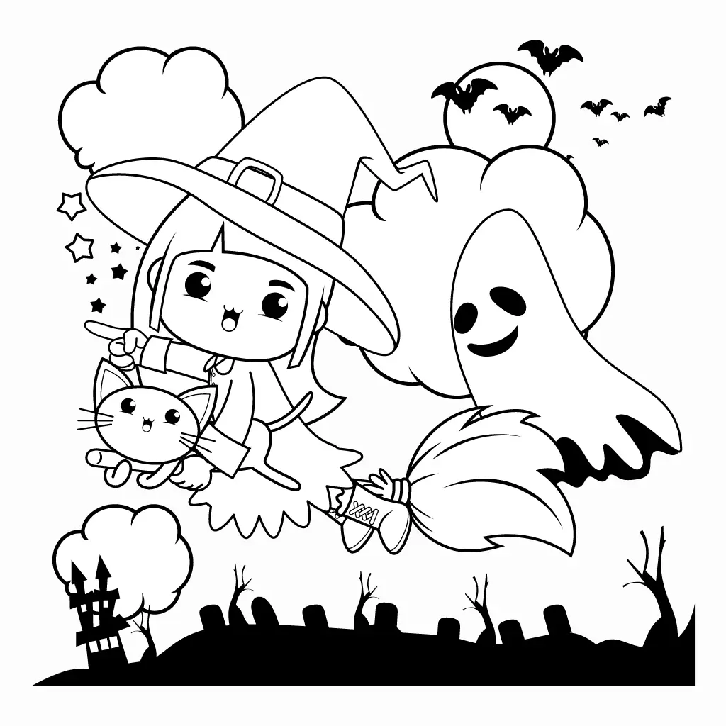 Disfruta coloreando este dibujo de una brujita con su escoba, fantasmas y un gato. Perfecto para niños, este dibujo es ideal para la temporada de Halloween.