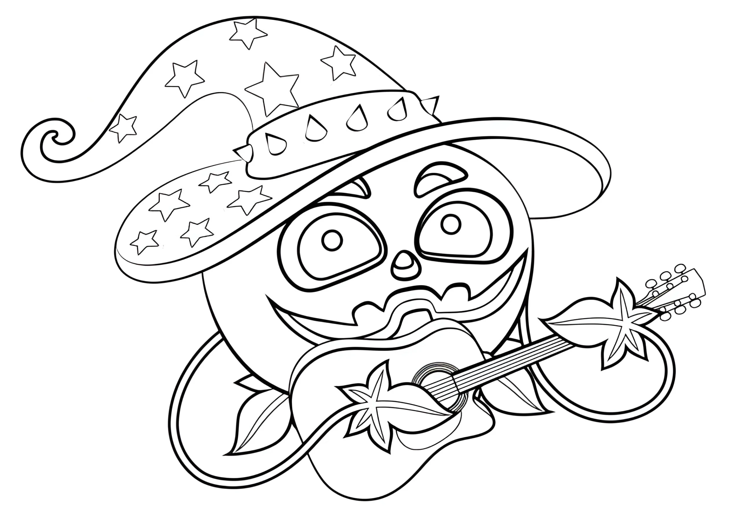 ¡Una calabaza con una guitarra mágica! Esta ilustración combina la música y la magia en una divertida escena de Halloween. Los niños podrán disfrutar coloreando a esta calabaza que toca la guitarra como un verdadero mago. Un diseño entretenido que hará que el espíritu de Halloween cobre vida con colores vibrantes.