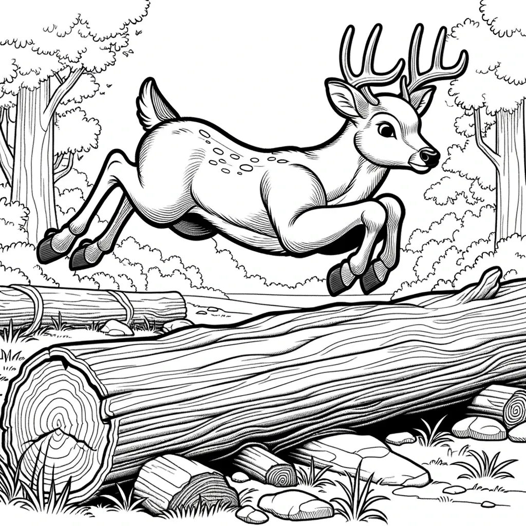 Disfruta de la energía y la gracia de un ciervo saltando sobre un tronco con este dibujo para pintar. Una imagen vibrante y llena de acción.