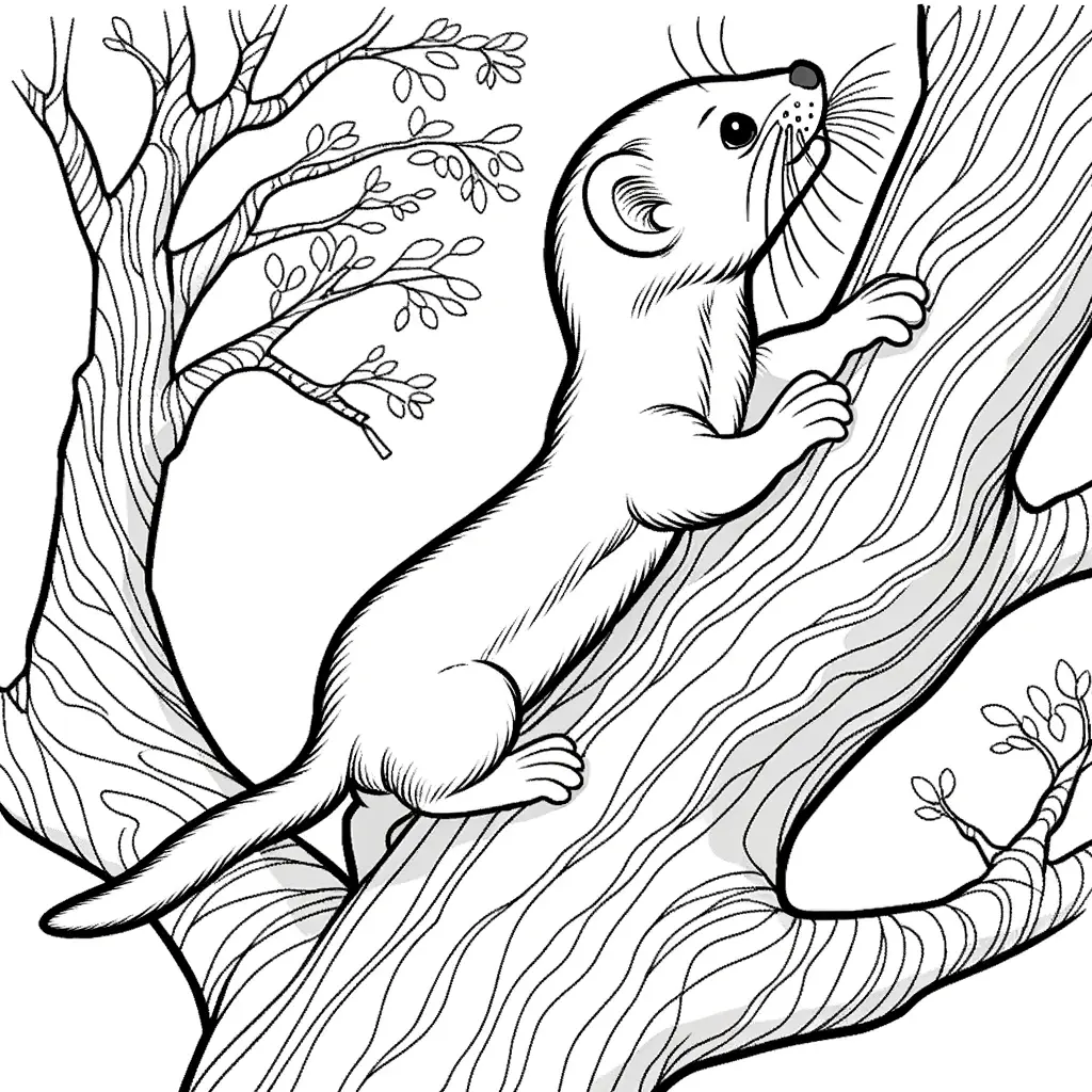 Disfruta de la agilidad y la destreza de una comadreja trepando un árbol con este dibujo para colorear. Ideal para momentos de creatividad y diversión.