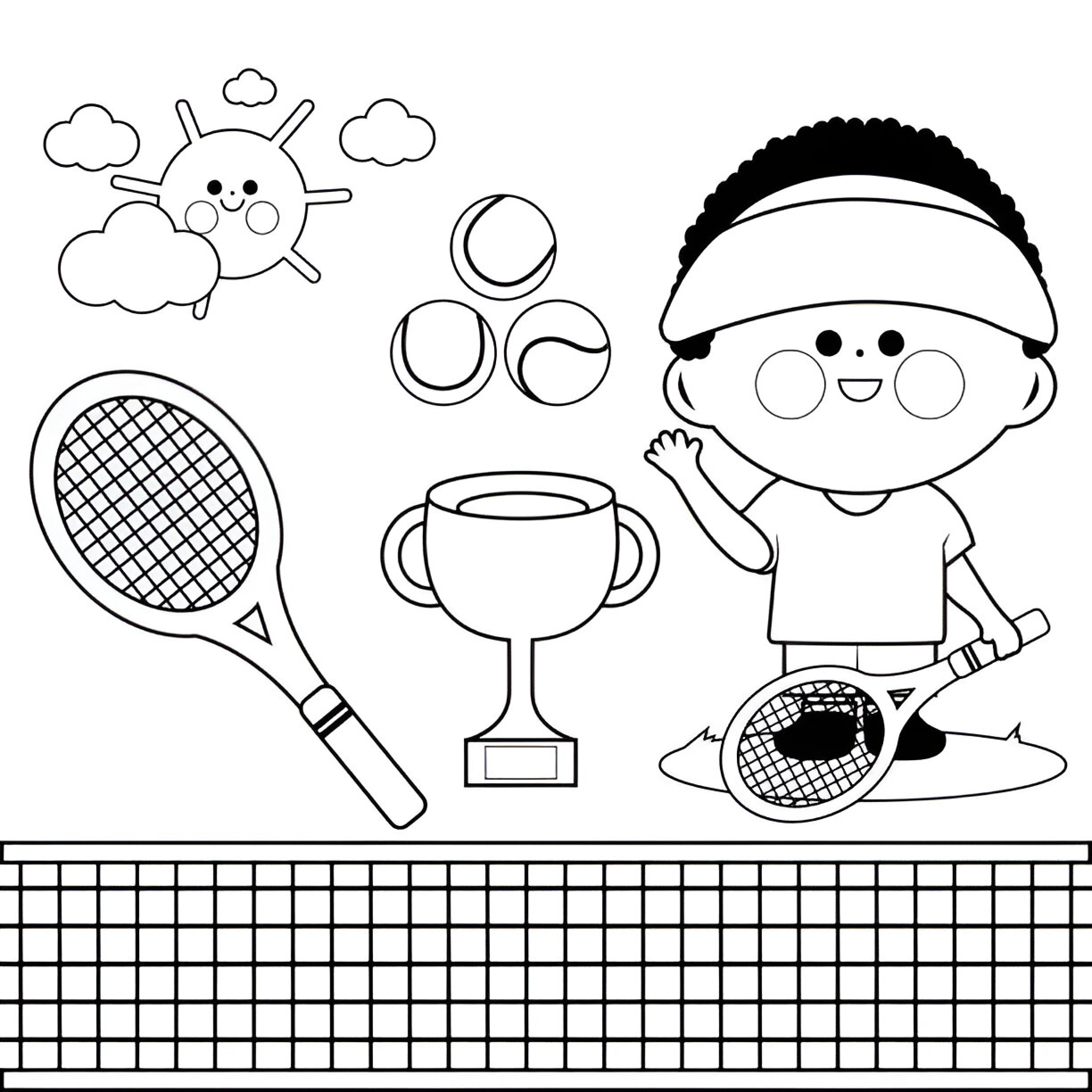 Este divertido dibujo muestra a un niño jugando al tenis con su trofeo. Ideal para colorear, el diseño kawaii lo hace perfecto para niños pequeños que buscan una actividad entretenida. Este dibujo ayuda a desarrollar la creatividad mientras introduce a los niños en el emocionante mundo del tenis.
