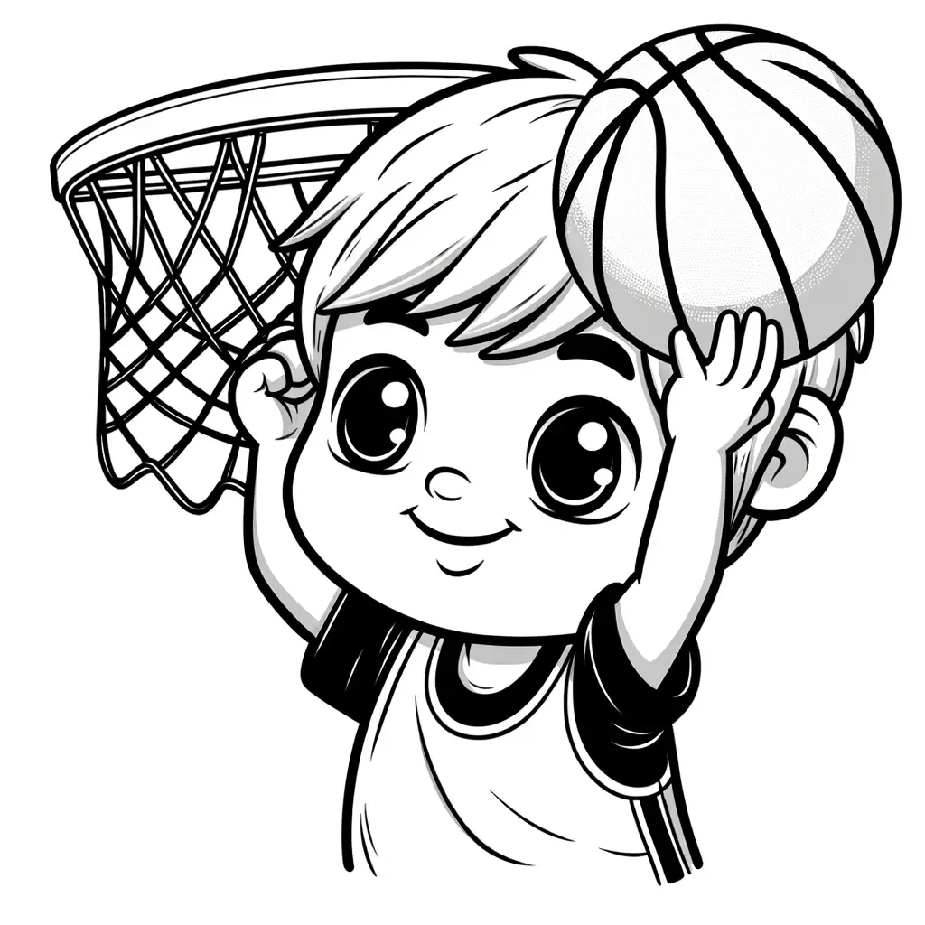 Colorea a este niño pequeño celebrando después de encestar el balón en una canasta de baloncesto.