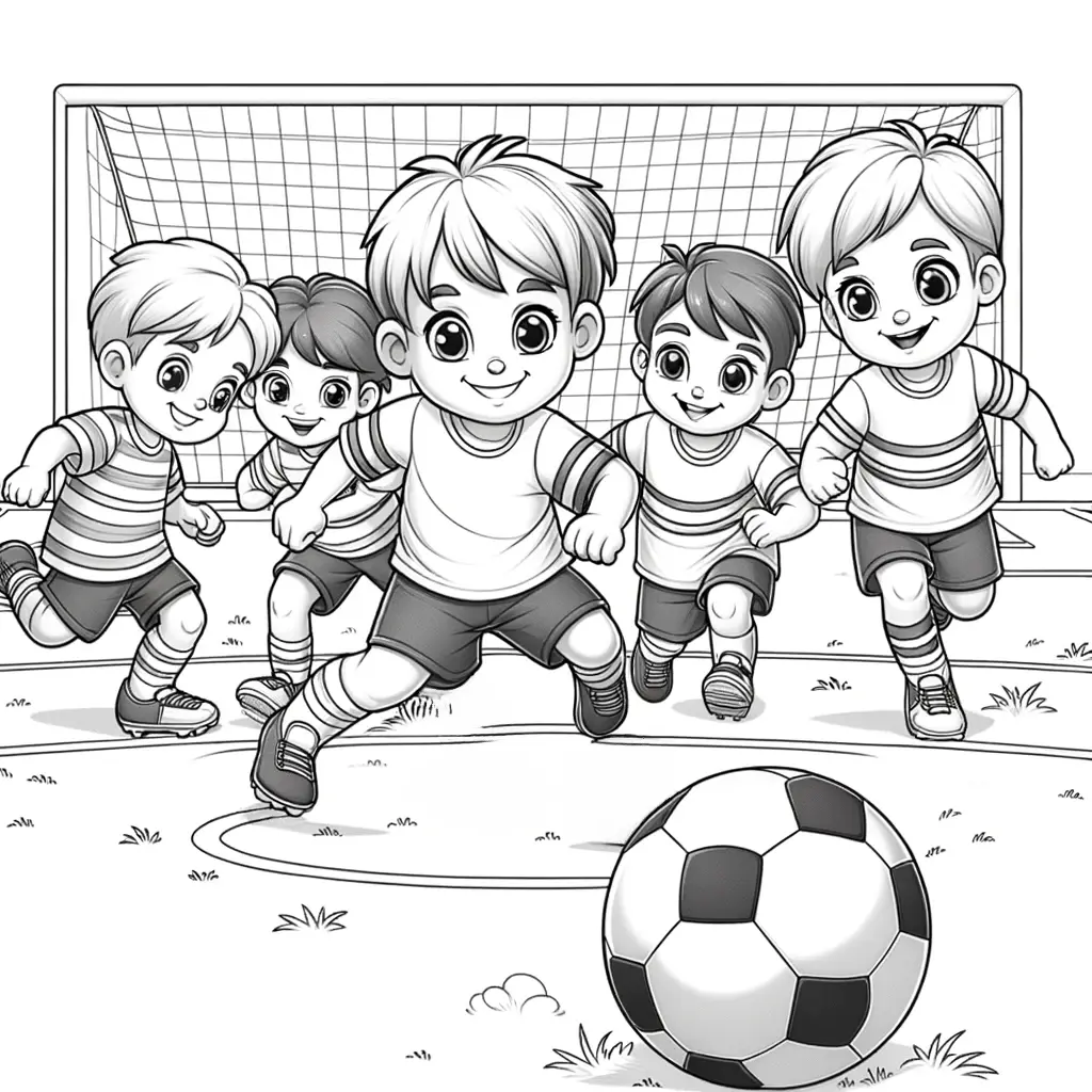 Colorea a este equipo infantil de fútbol en acción durante un emocionante partido.