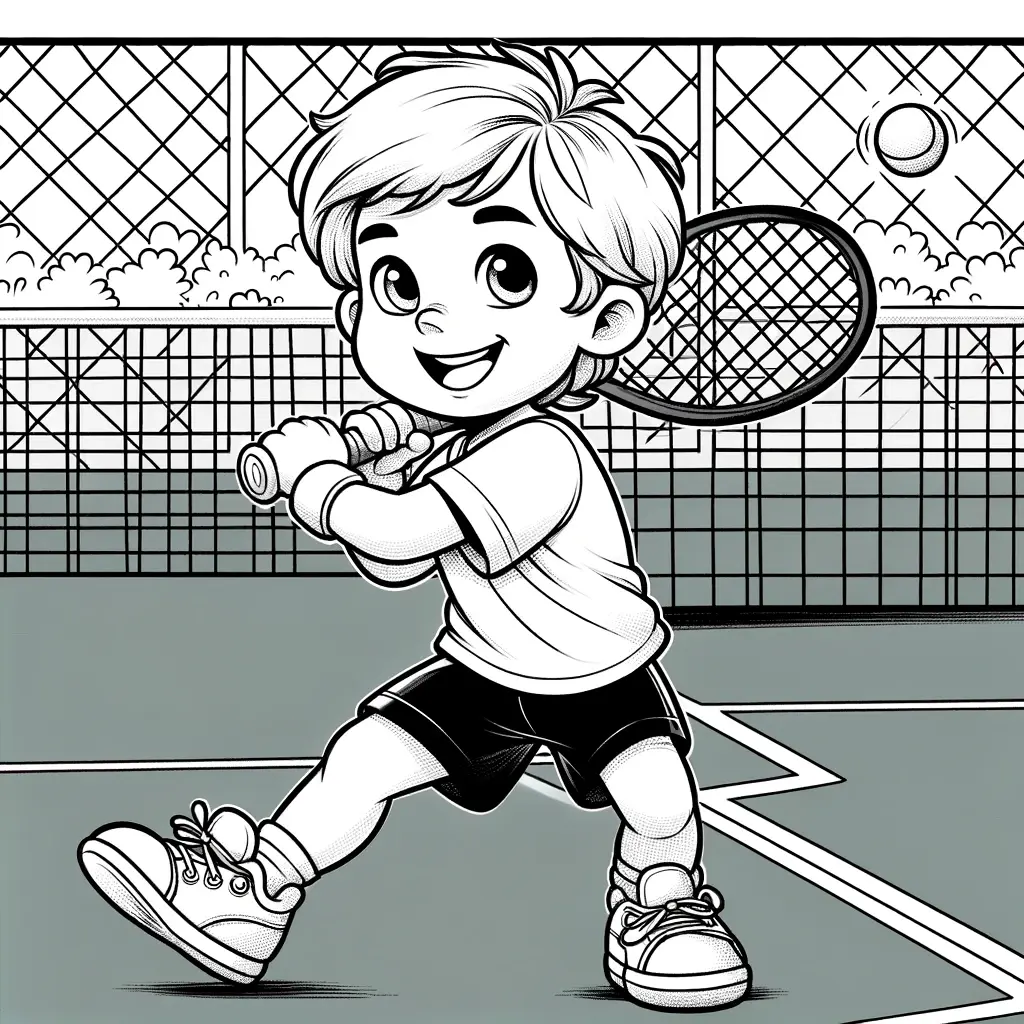 Dibujo para colorear de un niño practicando tenis en el campo, preparándose para golpear la pelota.