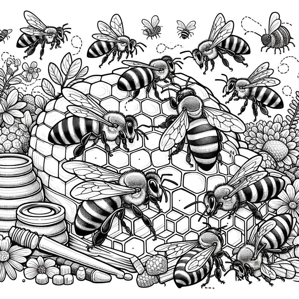Un dibujo de una abeja trabajando arduamente en su colmena, ideal para colorear y entender la vida en una colmena.
