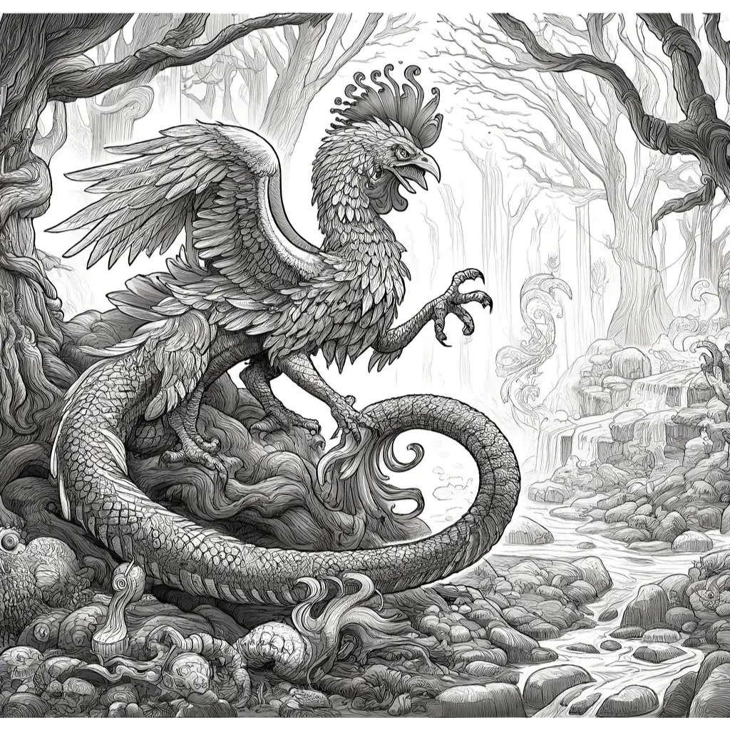 Este dibujo de un dragón en el bosque es perfecto para los pequeños artistas. Los detalles del bosque y el dragón ofrecen una experiencia de coloreado única y mágica.