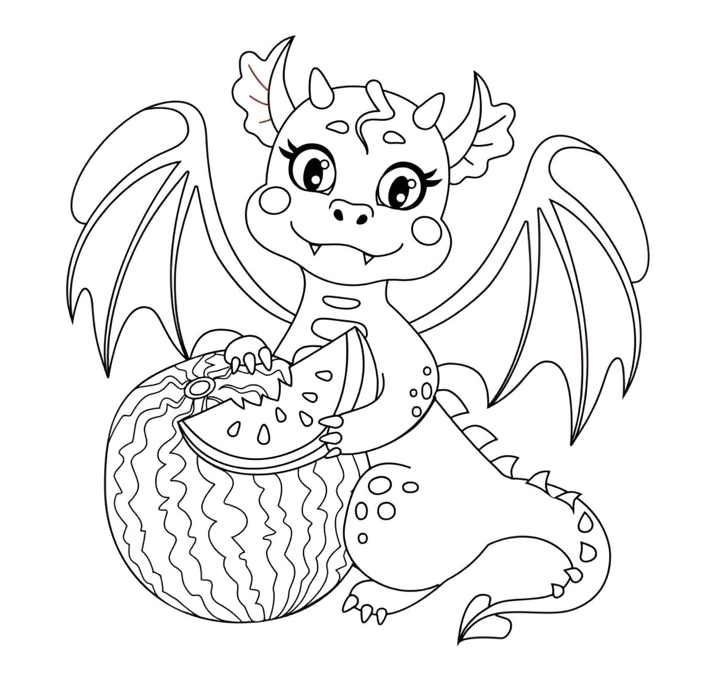 Un dragón simpático disfrutando de una refrescante sandía es la escena perfecta para los más pequeños. Este dibujo para pintar es divertido y encantador, ideal para fomentar la creatividad de los niños mientras disfrutan de una escena veraniega con un toque mágico.