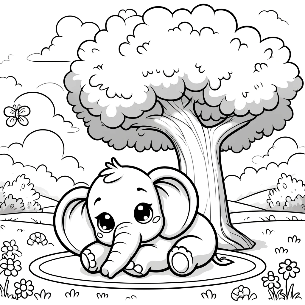 Relájate coloreando este tierno elefante durmiendo bajo un árbol. Perfecto para una tarde tranquila, esta imagen invita a la calma y es ideal para imprimir y disfrutar con los niños.