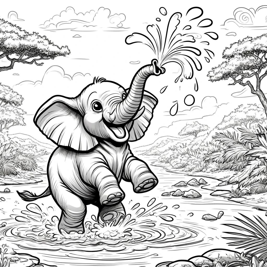 Sumérgete en la diversión con este elefante jugando en el agua. Una imagen refrescante para colorear que captura el amor de estos animales por el agua. Ideal para todas las edades.