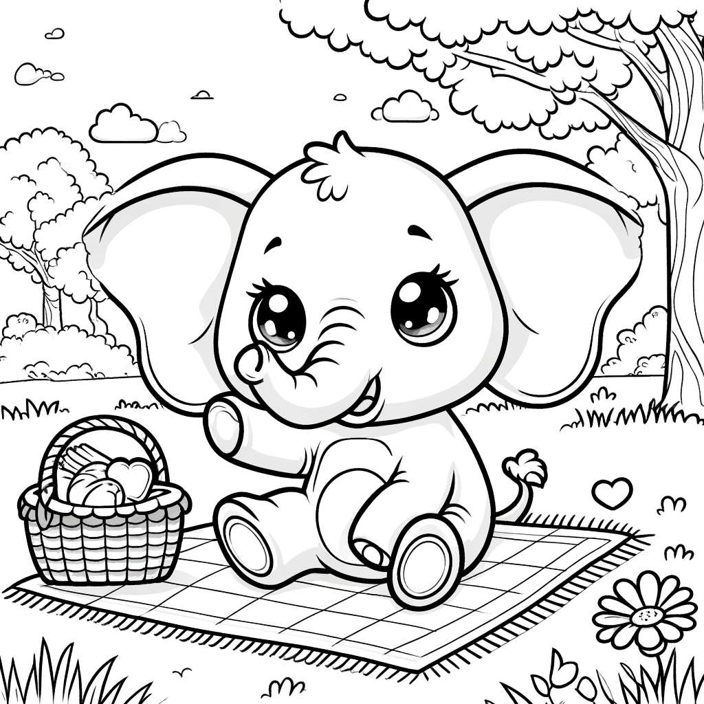 Disfruta coloreando este encantador elefante en un picnic. Una escena divertida y amigable que es perfecta para imprimir y compartir con los más pequeños. Ideal para una actividad de tarde.