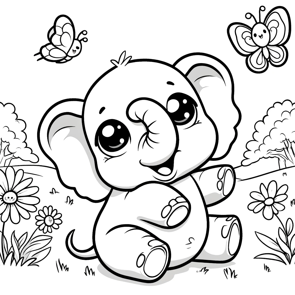 Un elefante jugando con mariposas es el centro de esta imagen para colorear. Perfecta para imprimir y colorear, captura un momento de pura alegría y es ideal para niños.