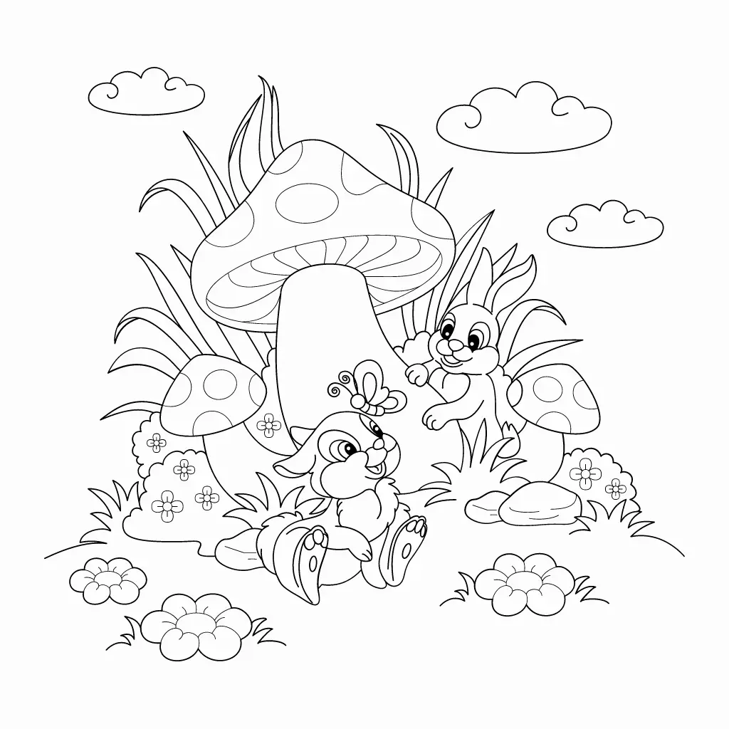 Colorea esta escena que incluye una ardilla y otros animales del bosque alrededor de una seta. Ideal para aprender sobre la vida en el bosque.