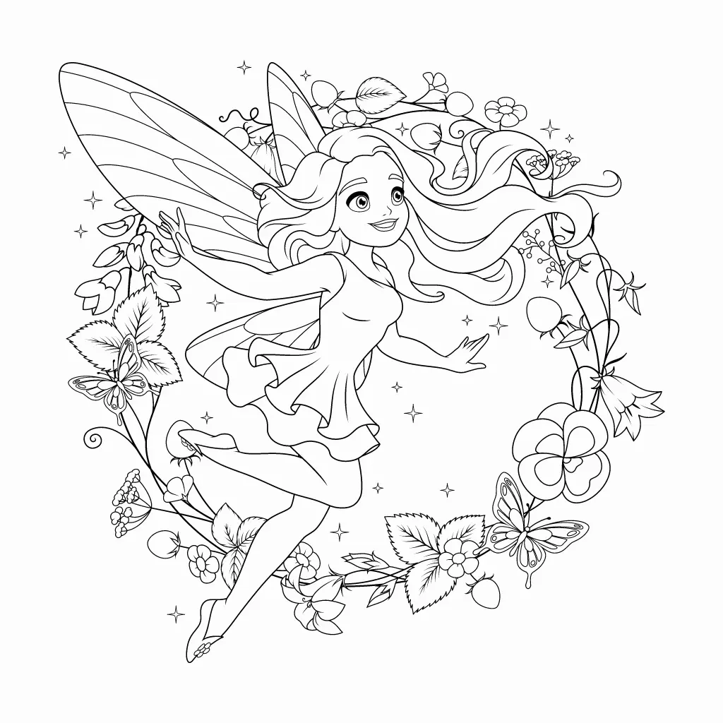 Un hermoso dibujo de un hada en vuelo con flores alrededor, perfecto para colorear fácilmente. Ideal para los pequeños artistas.