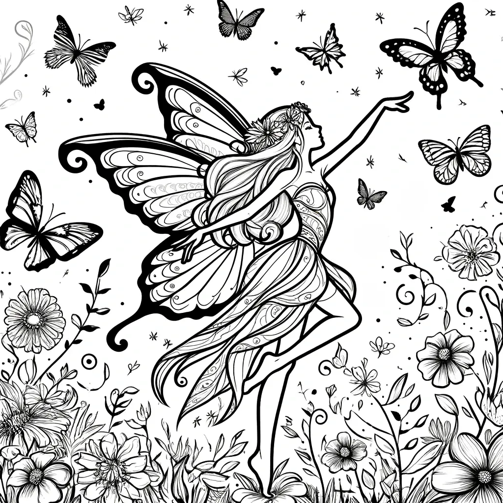 Un dibujo mágico de una hada y mariposas bailando en un jardín. Perfecto para colorear y dejar volar la imaginación.