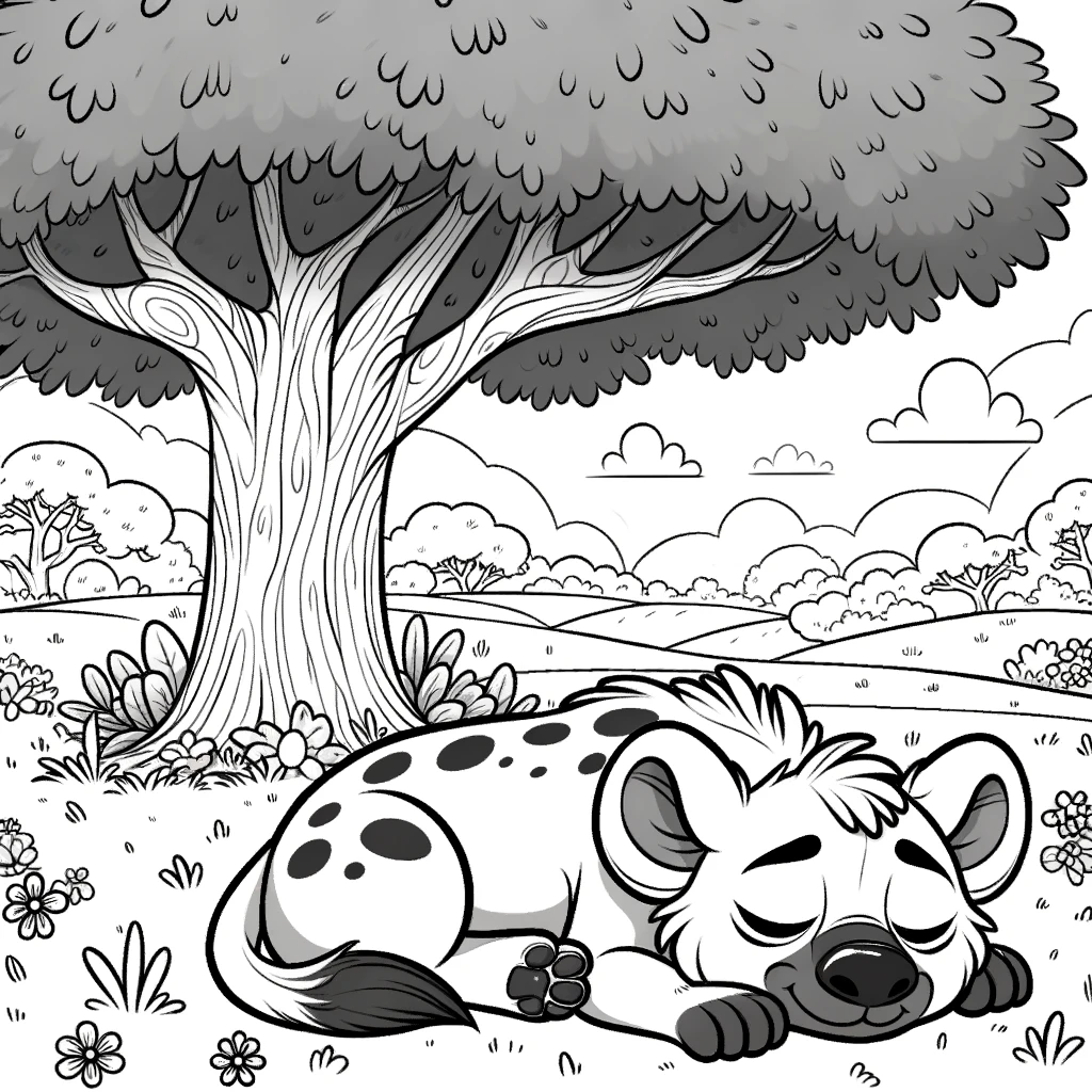 Relájate coloreando esta imagen de una hiena descansando bajo un árbol. Una escena tranquila y serena, ideal para imprimir y disfrutar con los niños.