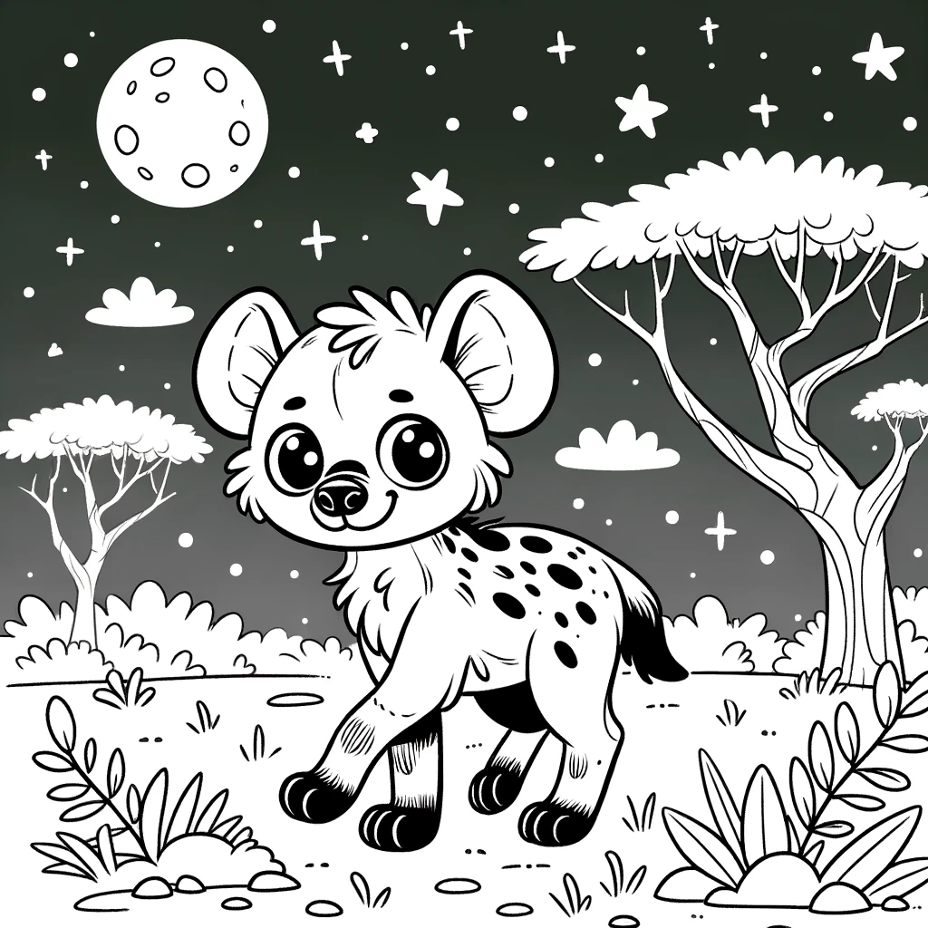 Imprime y colorea esta mágica imagen de una hiena paseando bajo la luna. Perfecta para una actividad nocturna, esta imagen capturará la imaginación de los niños.