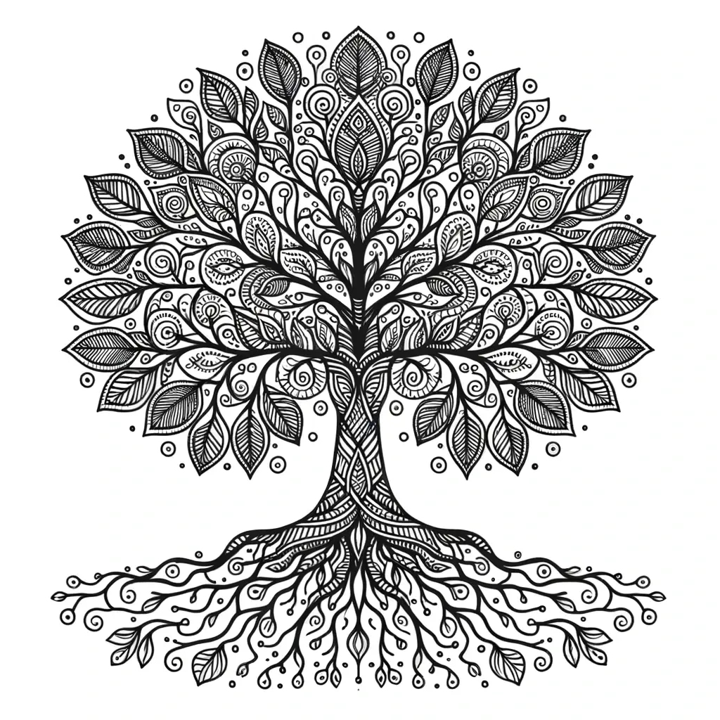 Sumérgete en el detalle de este árbol de la vida diseñado para adultos. Colorear esta imagen detallada puede ser una experiencia terapéutica y relajante.