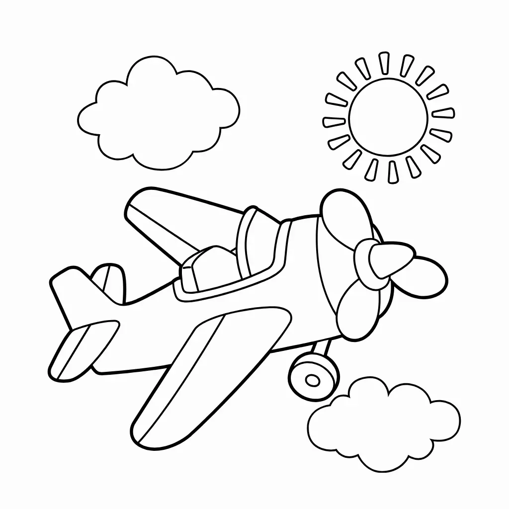 Deja que los niños se diviertan coloreando este avión volando entre el sol y las nubes. Una imagen perfecta para pequeños artistas.