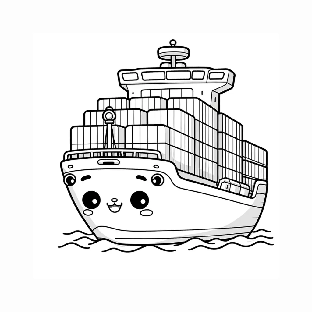 Disfruta coloreando este dibujo de un barco de carga con una sonrisa. Ideal para niños y amantes del mar que desean explorar el mundo marítimo.