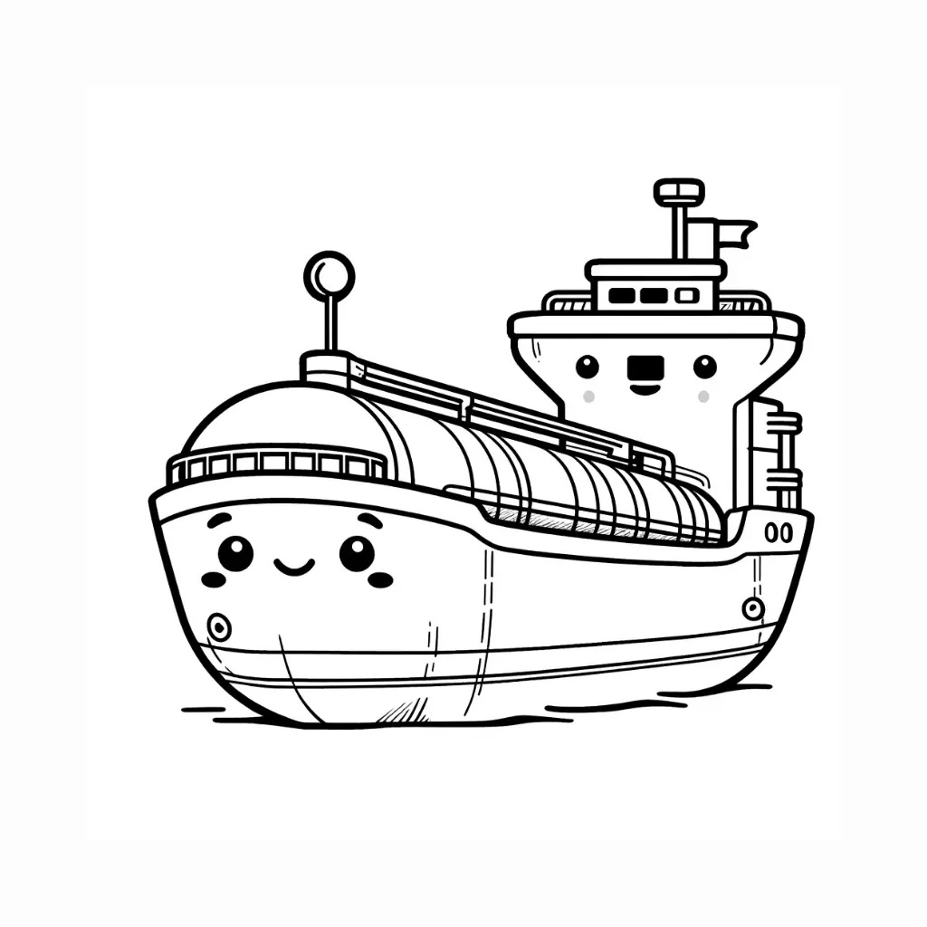 Colorea este dibujo de un buque de carga con una expresión amigable. Ideal para aprender sobre los buques y el transporte marítimo.