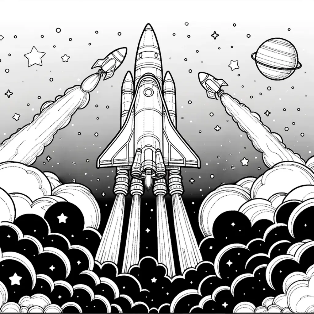 Explora el cosmos con este vibrante dibujo de un cohete espacial rodeado de estrellas y planetas. Ideal para despertar la curiosidad por el espacio en los más pequeños.