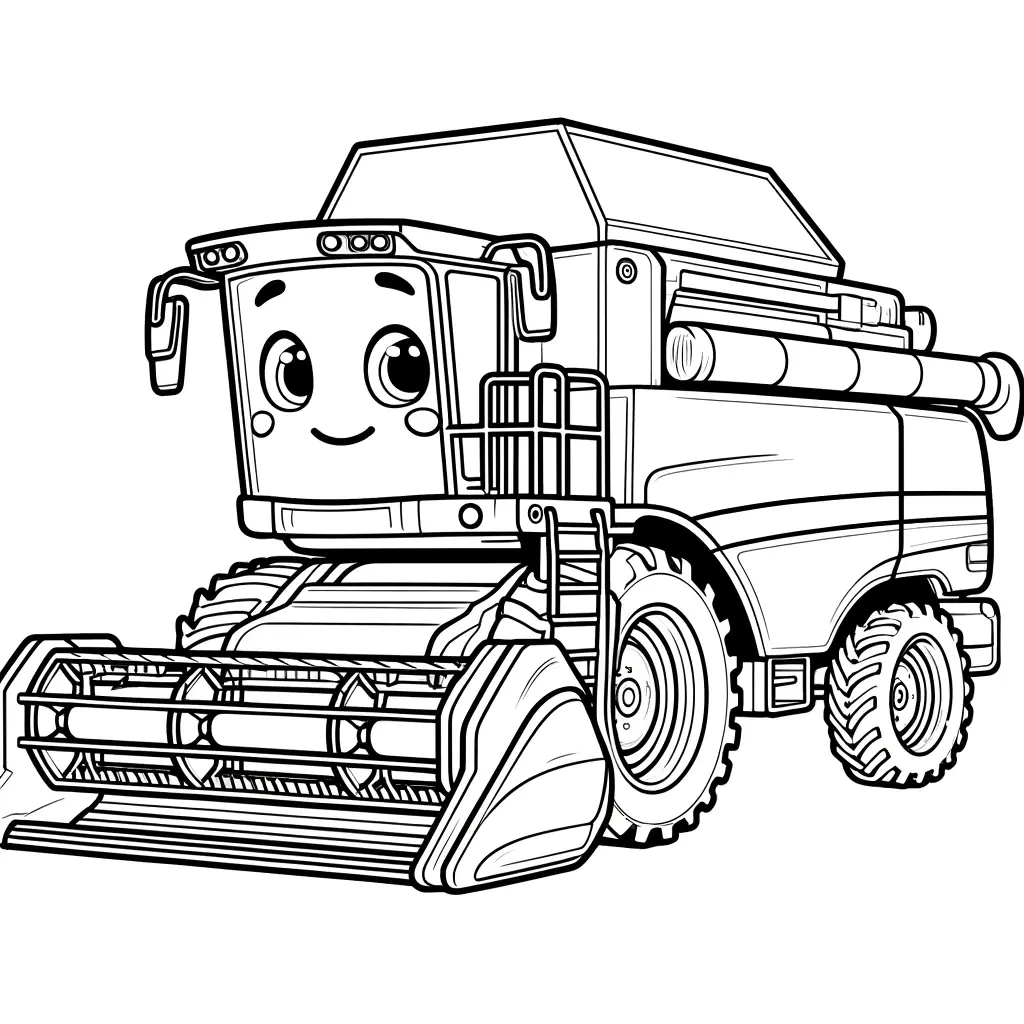 Colorea esta adorable cosechadora sonriente con facilidad. Perfecto para aprender sobre maquinaria agrícola mientras te diviertes.
