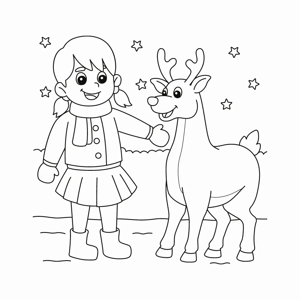 Diviértete coloreando este dibujo de un reno navideño junto a una niña feliz. Ideal para disfrutar en la época más especial del año.