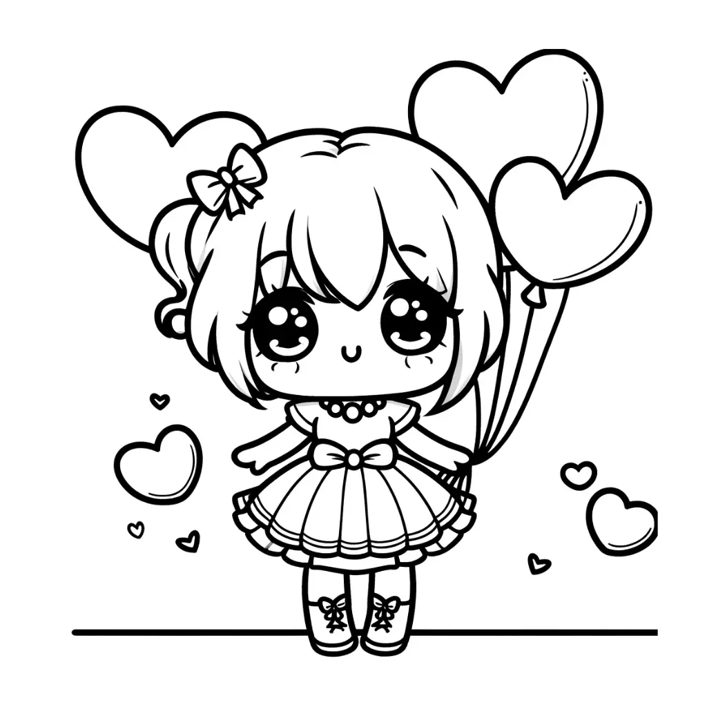 Colorea esta niña con globos en estilo kawaii y disfruta de su inocencia y alegría. Ideal para niños y niñas que aman las celebraciones.