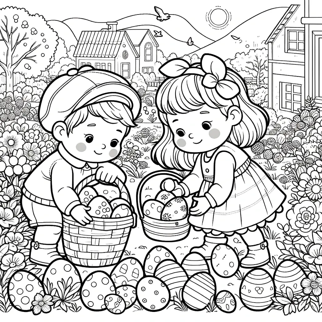 Diviértete pintando este dibujo de niños buscando huevos de Pascua. Perfecto para disfrutar en familia.
