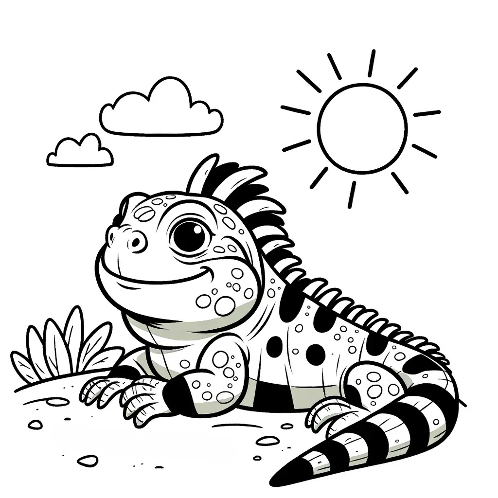 Observa esta iguana relajada tomando el sol en este dibujo para colorear, ideal para que los niños aprendan sobre estos reptiles mientras se divierten.