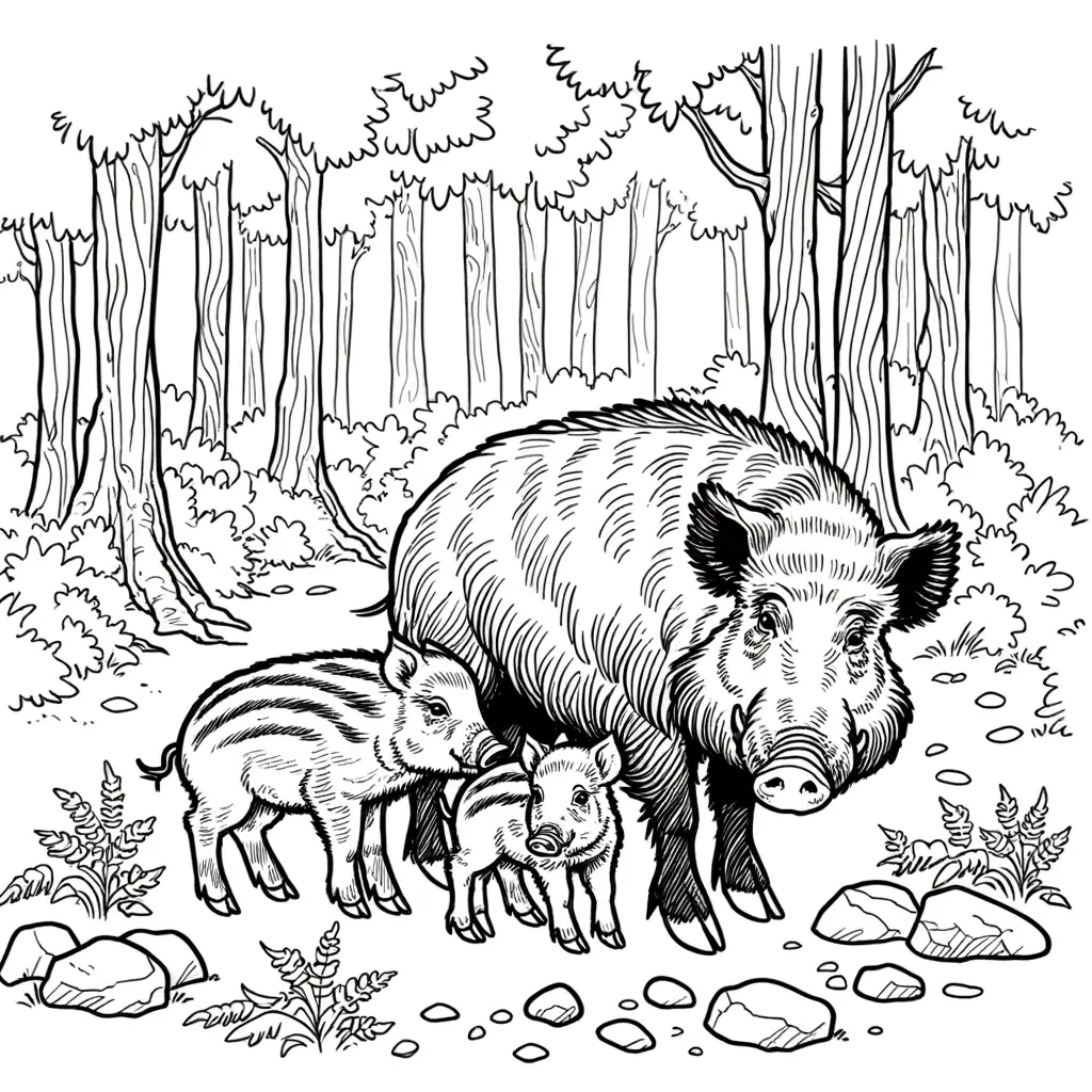 Pinta esta adorable escena de un jabalí con sus crías en el bosque. Perfecto para que los niños se diviertan y aprendan sobre la vida silvestre.