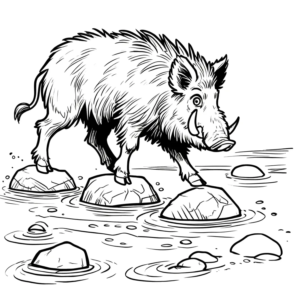 Pinta la fuerza y la determinación de un jabalí robusto cruzando un río en el bosque con este dibujo para colorear. Ideal para momentos de creatividad.