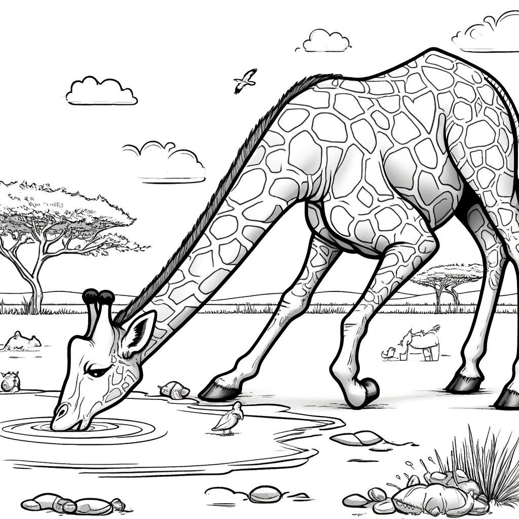 Disfruta coloreando esta imagen de una jirafa bebiendo agua. Una escena tranquila que refleja la vida en la sabana, perfecta para imprimir y colorear.