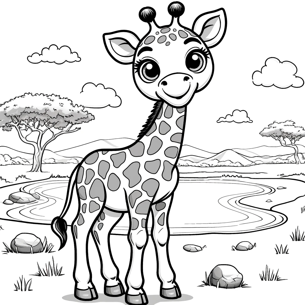 Explora la sabana coloreando esta imagen de una jirafa en su hábitat natural. Perfecta para niños, esta imagen es ideal para imprimir y disfrutar.