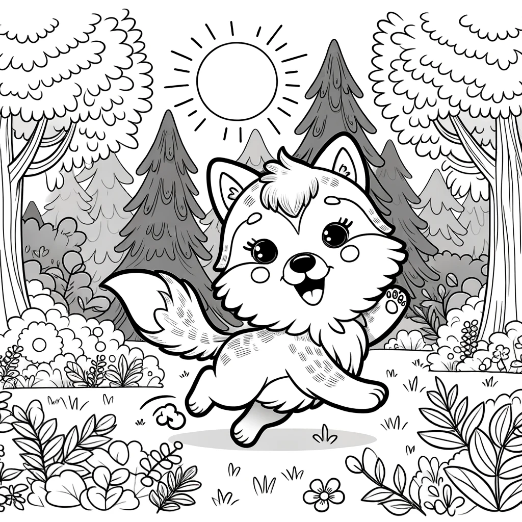 Disfruta coloreando este alegre lobo corriendo por el bosque. Una escena llena de energía y diversión, ideal para niños.