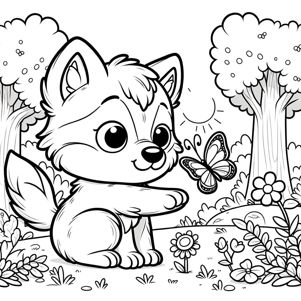 Disfruta de este adorable lobo jugando con una mariposa. Un dibujo encantador para niños, fácil de imprimir y colorear.