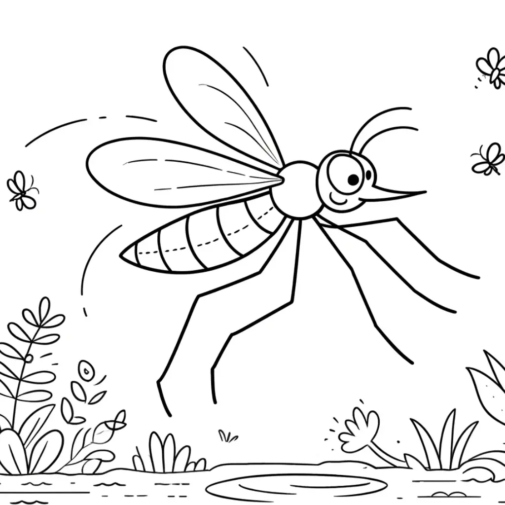 Colorea este dibujo de mosquito en un entorno de jardín, perfecto para actividades creativas para niños.