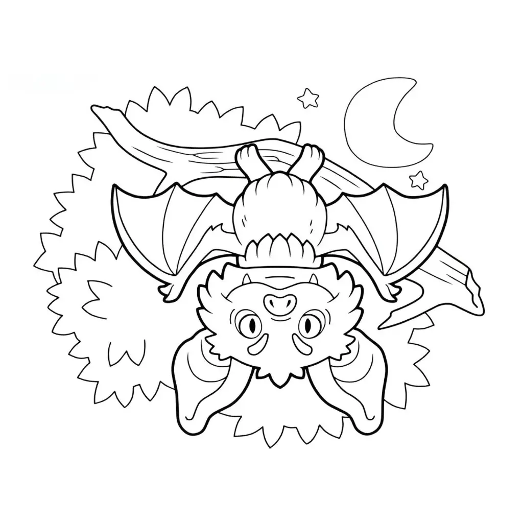 Este murciélago está descansando tranquilamente boca abajo, una imagen clásica y relajada que encantará a los niños que buscan un diseño fácil para colorear. Es perfecto para aquellos que disfrutan de la tranquilidad mientras dejan volar su imaginación con los colores que más les gusten. ¡Una actividad creativa que no te puedes perder!