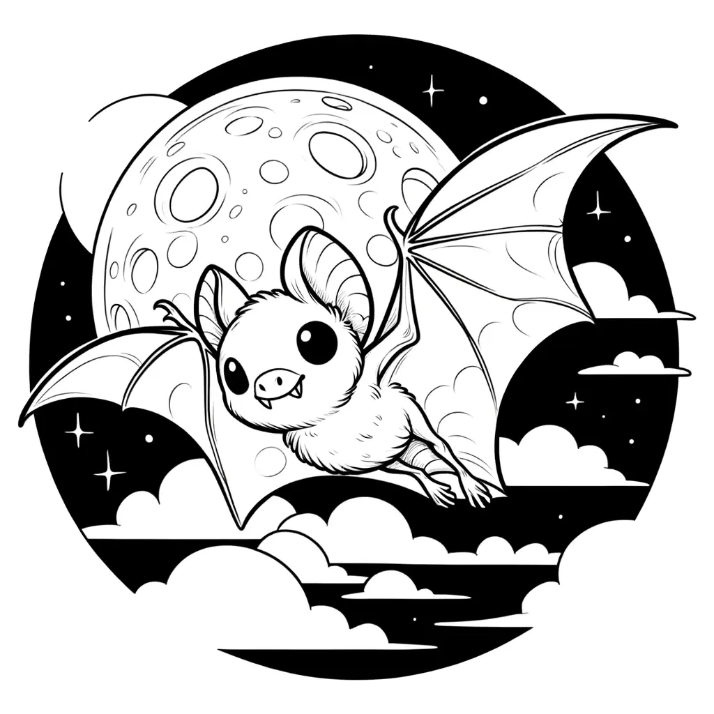 Explora la magia de la noche con este dibujo para colorear de un murciélago volando bajo la luna llena. Ideal para los amantes de la fauna nocturna.