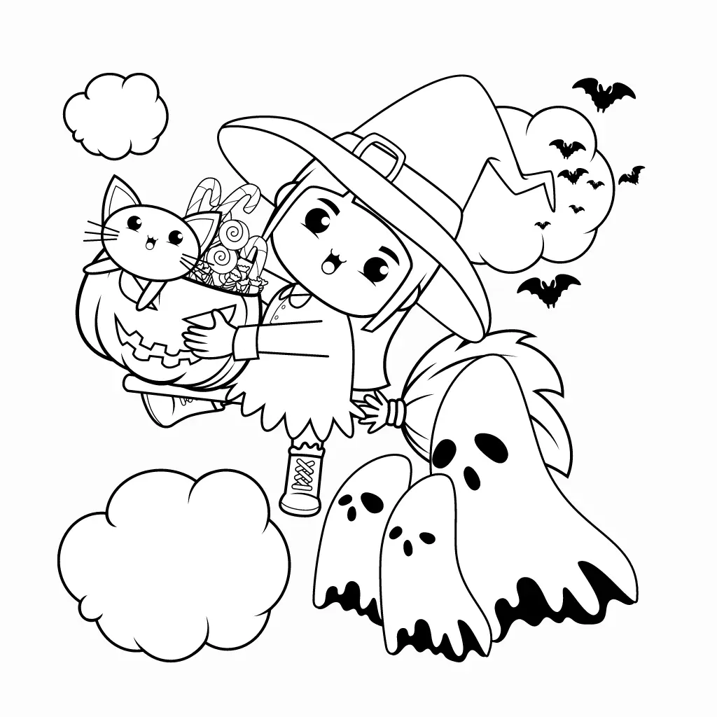 Colorea esta niña bruja con su gato y fantasmas. Un dibujo fácil y perfecto para los niños en Halloween.