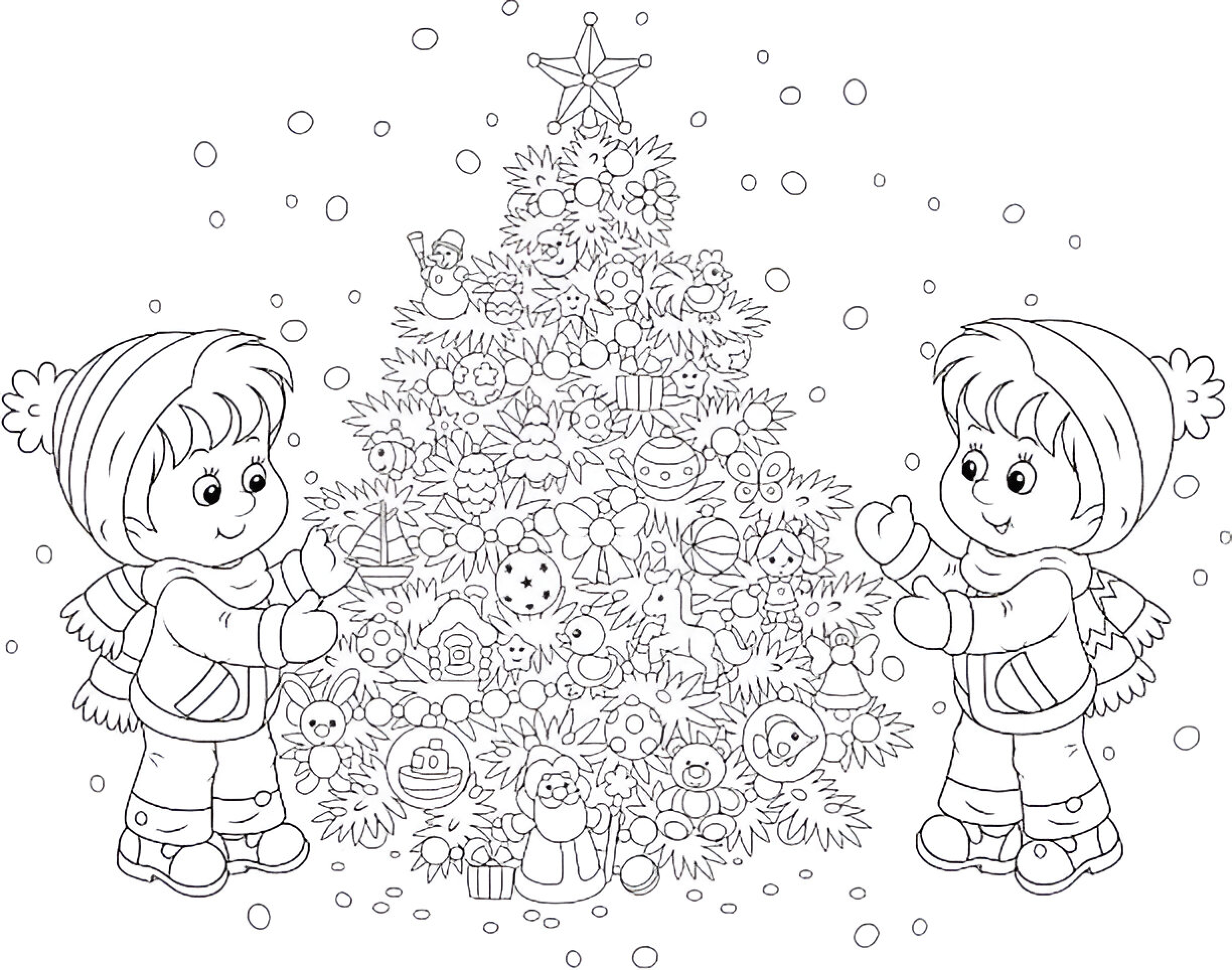 Un lindo dibujo de niños decorando un árbol de Navidad que trae alegría y emoción a las fiestas. Colorear esta imagen es una excelente manera de que los niños se sientan parte de la preparación navideña mientras desarrollan habilidades motoras finas y se divierten. Ideal para pasar tiempo en familia.