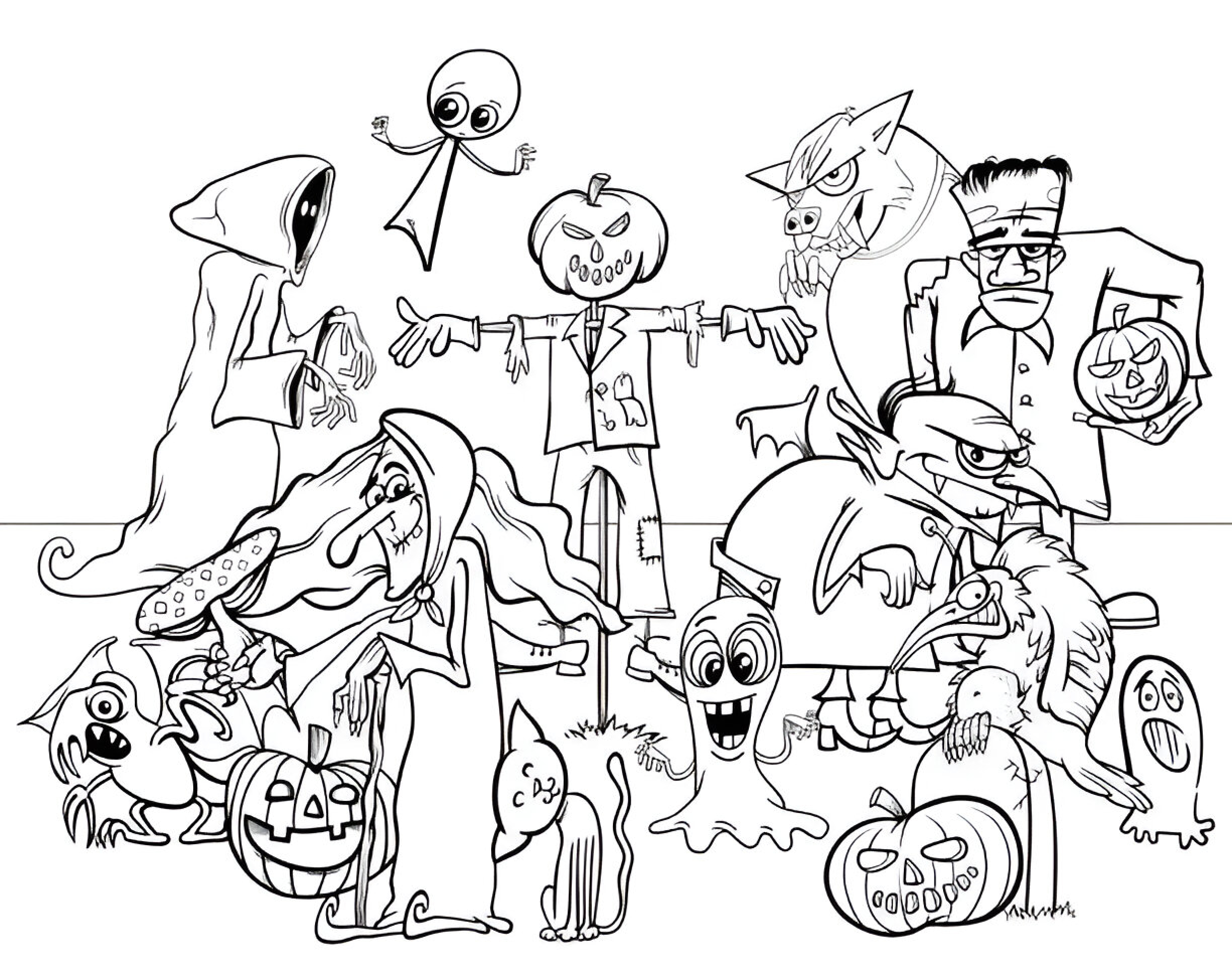 Llena de personajes aterradores pero adorables, esta página para colorear es ideal para los pequeños amantes de Halloween. Los niños pueden disfrutar pintando estos monstruos amigables, perfectos para añadir un toque de espanto a la temporada más terrorífica del año. Una actividad entretenida para todos.