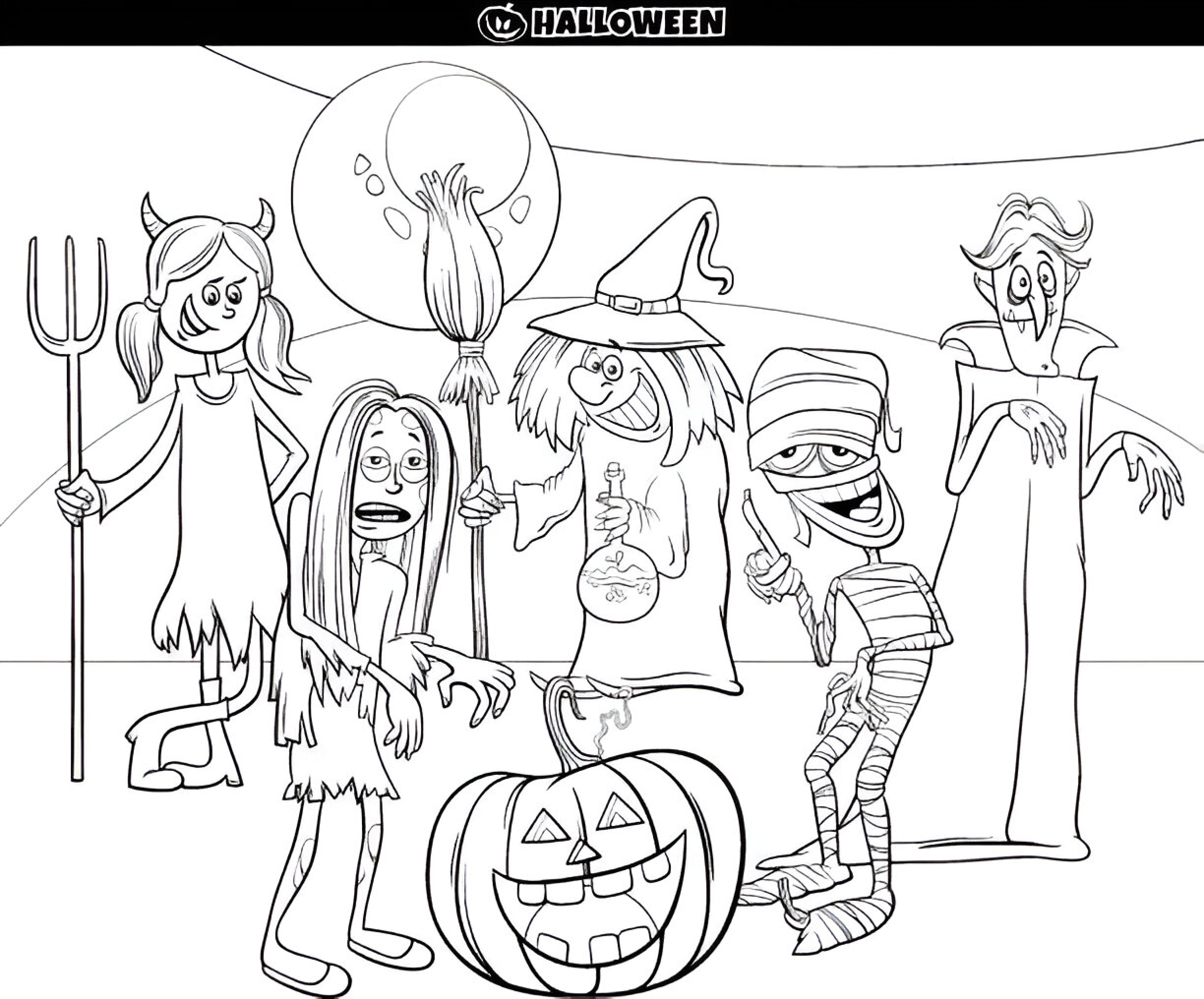 Página para colorear de personajes divertidos de dibujos animados de vacaciones de halloween
