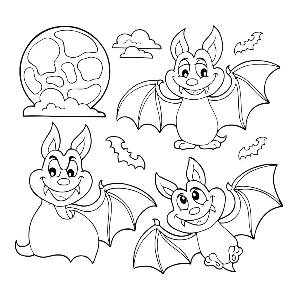 Un conjunto de murciélagos divertidos están esperando a que los llenes de color en esta página para colorear. Con sus expresiones únicas y graciosas, este diseño es ideal para los niños que aman los animales y las aventuras nocturnas. ¡Llena de vida a cada uno de estos simpáticos personajes con tus colores favoritos!