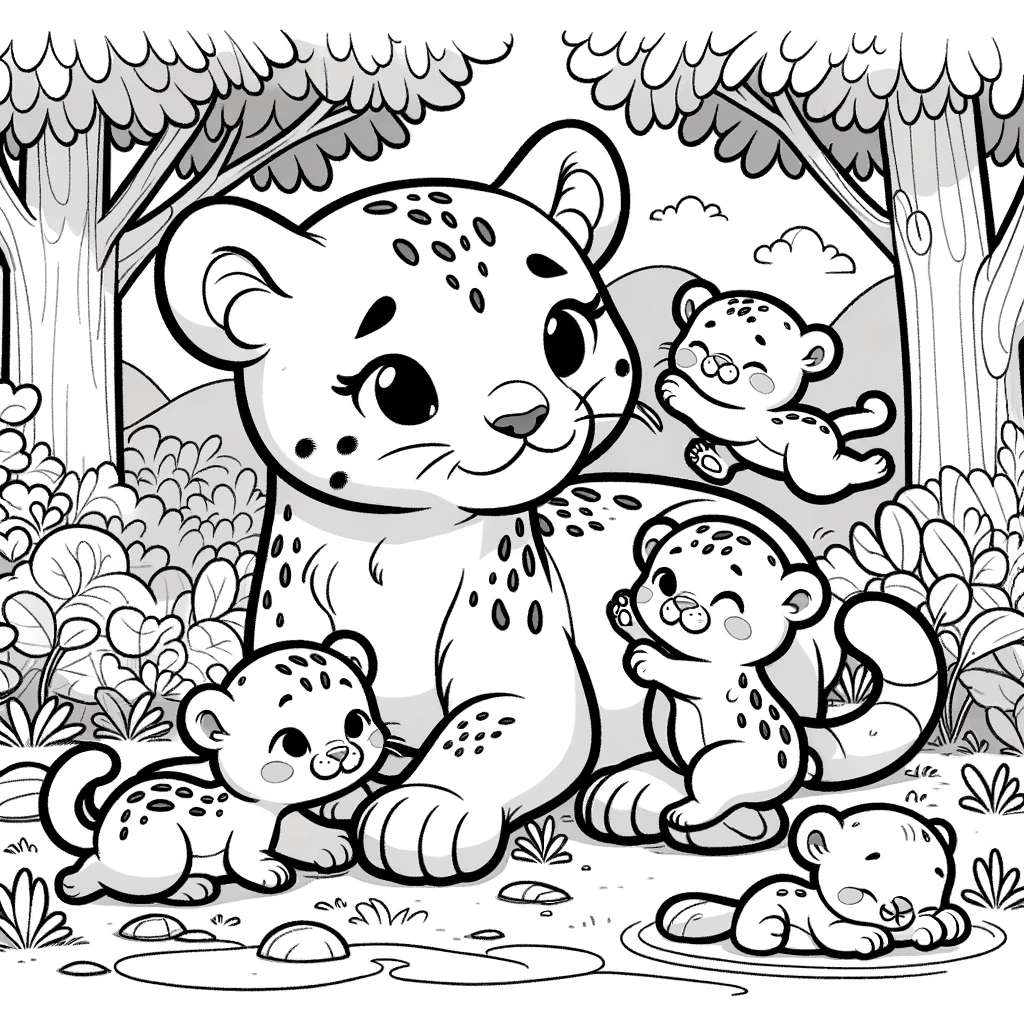 Disfruta coloreando esta hermosa pantera cuidando a sus cachorros. Un dibujo perfecto para imprimir y para que los niños desarrollen su creatividad.